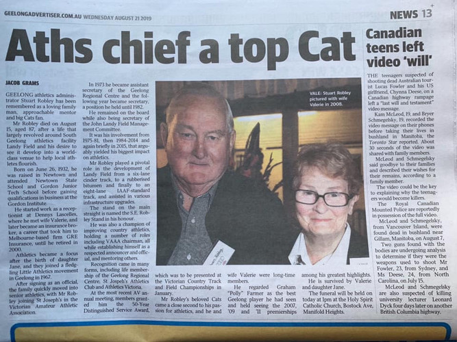 On 23rd June 1988, Stuart, along with Fred Graf (GHY), Stan Nicholls OAM (BHA), Henry Schubert (SSH) and Mark Shilston (COB) was elected to Life Membership of Athletics Victoria. He continued to assist AV during the 1990’s and 2000’s as the Returning Officer at the AV Annual Meeting. In 2001 Stuart was awarded the Australian Government Centenary Medal to recognise his long and valued contribution to Geelong Athletics and in 2010, was awarded Athletics Australia’s Platinum Service Award for 40+ years of service to athletics. Stuart enjoyed his regular outing during the winter months to the Geelong Cross Country Relay Championships where he was delighted presenting young athletes with the trophy named in his honour to the winning relay team. Final fitting recognition was at the recent AV Annual Meeting, where he was granted the 50 Year Distinguished Service Award by the members of AV. He was to have been presented with the award at the forthcoming Countries, scheduled for Geelong in January 2020. Due recognition of a gentleman, an approachable mentor for officials and club administrators as well as someone who endeavoured to provide opportunities for athletes to flourish and succeed. Stuart Robley passed away on Thursday 15th August 2019 aged 87. His funeral will be held on Wednesday 21st August 2019 at 1.00pm, at the Holy Spirit Catholic Church, Bostock Avenue, Manifold Heights (Geelong).